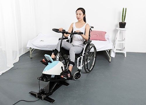 智能康復訓練器材包括底座,在兩側對稱的基礎上,分別在每個支架的內側安裝連接塊,連接件由電動推桿與垂直設置連接,實現連接件在直線導向柱上的上下滑動。